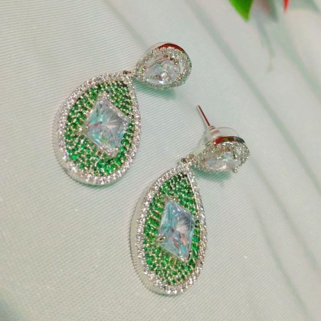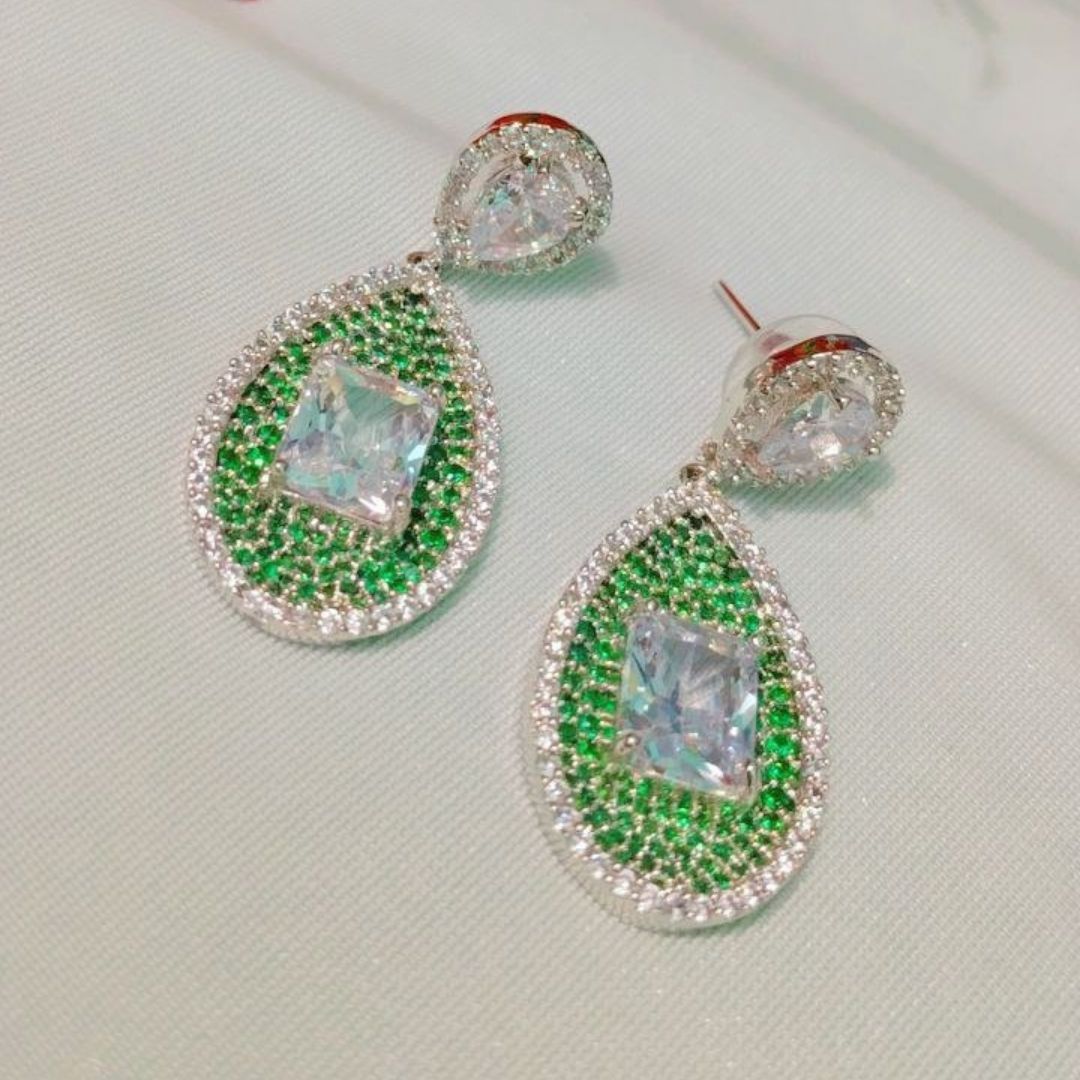 Grace meets glamour with these exquisite teardrop earrings, designed to capture timeless elegance. Featuring vivid green stones paired with a brilliant diamond centrepiece, each detail is crafted to radiate sophistication and charm. Perfect for weddings, festive occasions, or evening wear, these earrings bring a graceful pop of colour and sparkle to your jewellery collection.