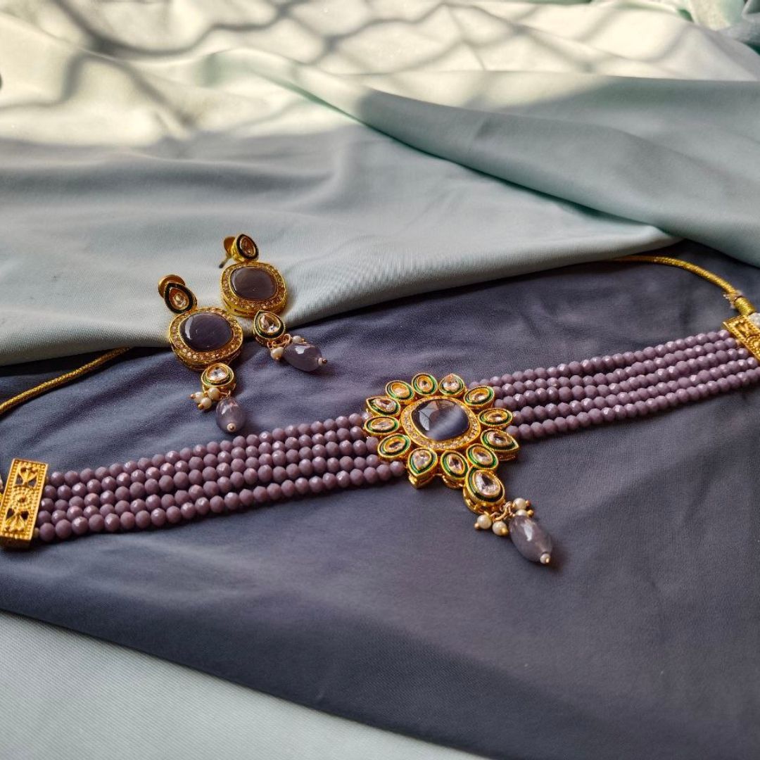 A captivating fusion of reverse-set American Diamonds, Monalisa stones, and hydraulic beads, this necklace brings together brilliance, color, and movement in perfect harmony. The reverse AD setting enhances the sparkle with a unique reflective play, while the luminous Monalisa stone adds depth and elegance. Finished with delicate hydraulic beads for a graceful drape, this piece is an exquisite choice for weddings, festive celebrations, or statement evenings.